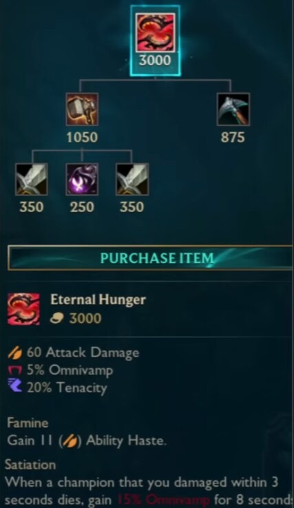 The Tenacity provided by Eternal Hunger is also valuable, since this stat has previously been available in a stable form only through Sterak’s Gage or Mercury's Treads. Being able to acquire Tenacity in a single item slot is a significant advantage for Zaahen.